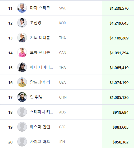TOP 1위 ~ 10위 TOP 11위 ~ 20위 2024년 LPGA 상금 랭킹 순위 (gold-name.com) 2024년 LPGA 상금 랭킹 순위TOP 1위 ~ 10위 TOP 11위 ~ 20위gold-name.com